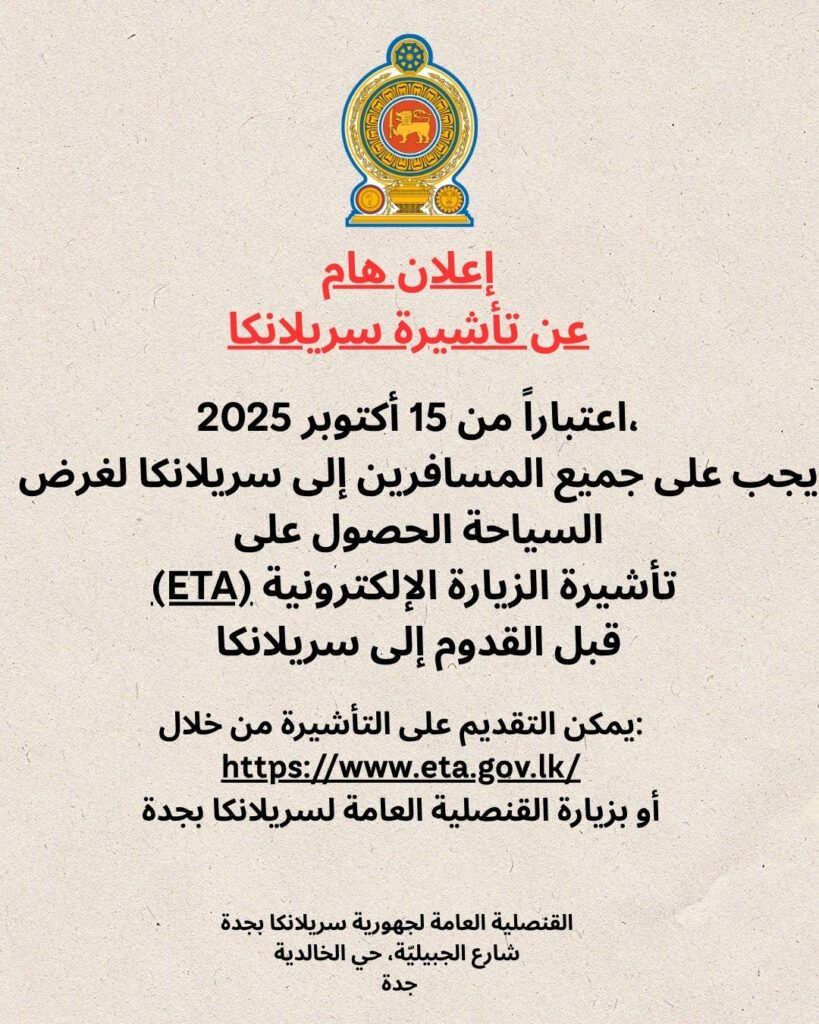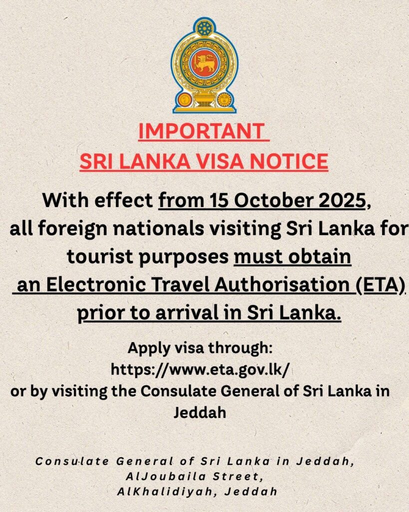 From 15 Oct2025,ALL foreign nationals visiting #SriLanka for tourist purposes must obtain an Electronic Travel Authorisation (ETA) prior to arrival in Sri Lanka.