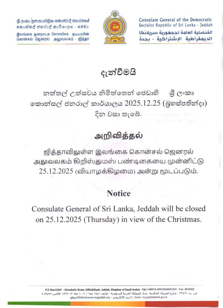 Notice Post author:SLCG Jeddah Post published:Tue _23 _December _2025AH 23-12-2025AD Post category:News You Might Also Like Invitation – 77th Anniversary of Independence Celebration of Sri Lanka Tue _21 _January _2025AH 21-1-2025AD Invitation – Thai Pongal Celebration of Consulate General of Sri Lanka – Jeddah Tue _21 _January _2025AH 21-1-2025AD CG Falah Mowlana held discussions with Mr Ahmed Bagaresh,Tebyan Law Firm Sun _17 _November _2024AH 17-11-2024AD