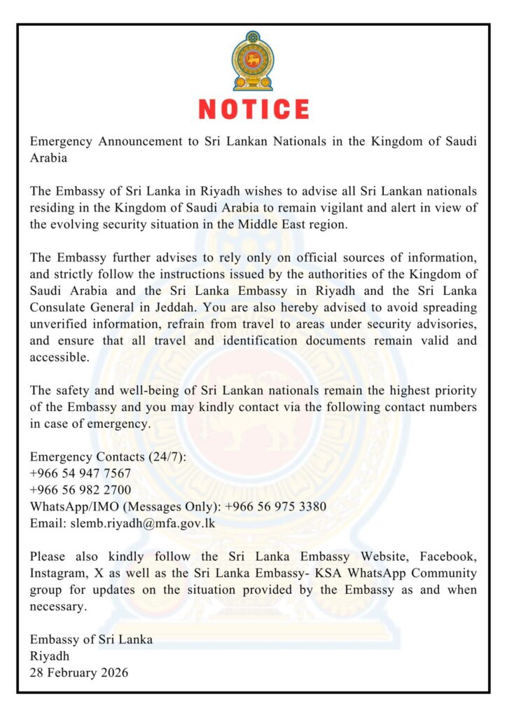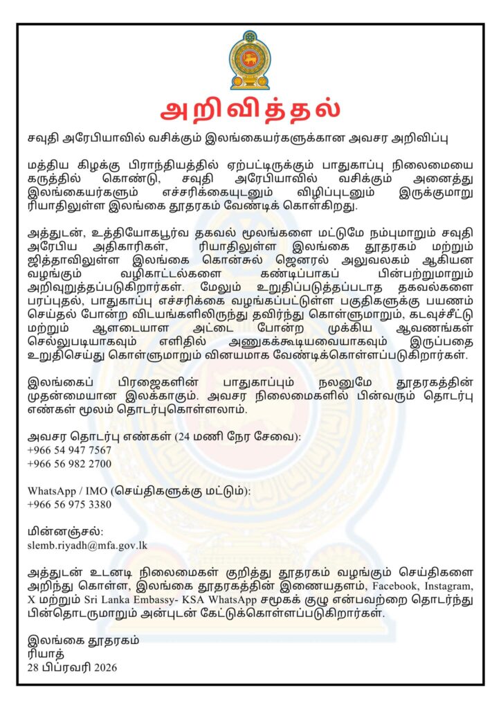 ஜித்தாவில் உள்ள இலங்கை துணைத் தூதரகத்தின் அவசர தொடர்பு விவரங்கள் பின்வருமாறு: